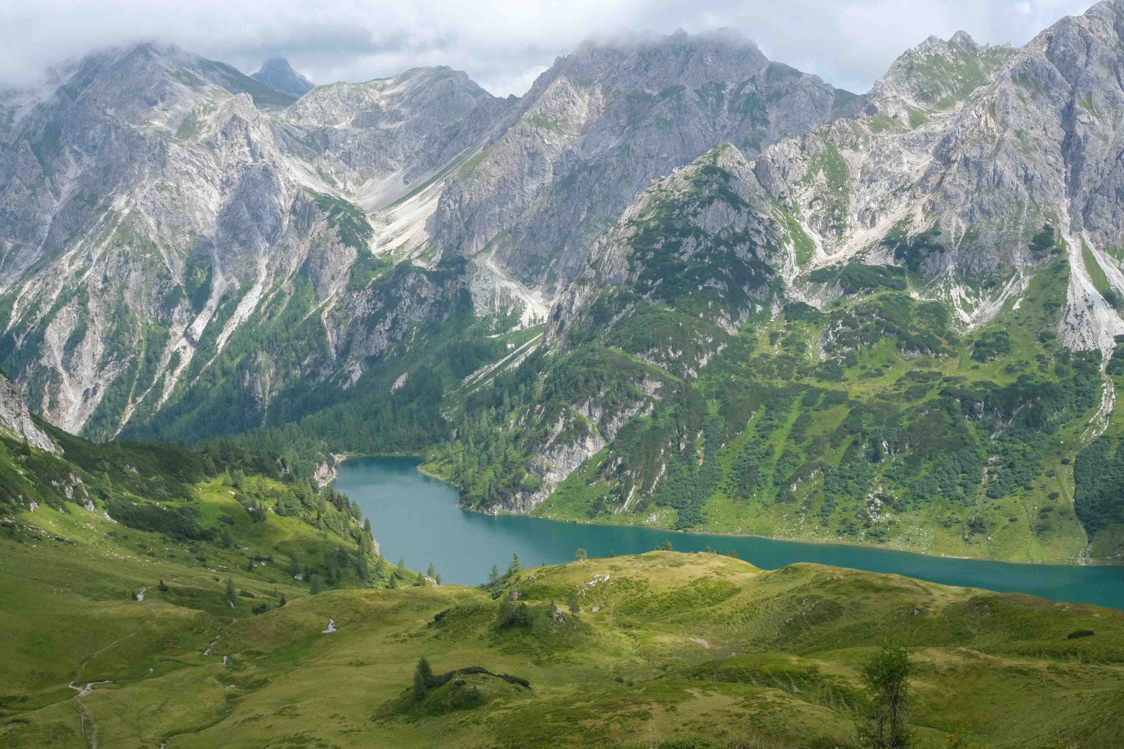 Wir erreichen das Törl. Sattgrüne Almwiesen fließen zum Ufer des Sees hinab. Gegenüber ragen die Felstürme der Ennskraxn und des Faulkogels in die tiefhängenden Wolken.